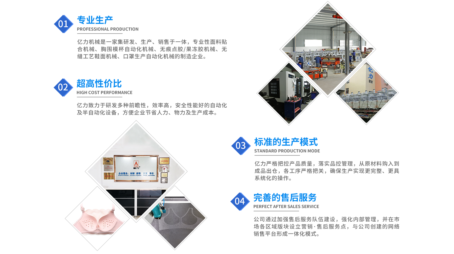 •   汕頭市億力機(jī)械設(shè)備有限公司是一家集研發(fā)、生產(chǎn)銷(xiāo)售于一體的專(zhuān)業(yè)性面料貼合機(jī)械、胸圍模杯機(jī)械、無(wú)縫工藝鞋面機(jī)械、口罩生產(chǎn)線(xiàn)和焊耳帶機(jī)械企業(yè)。